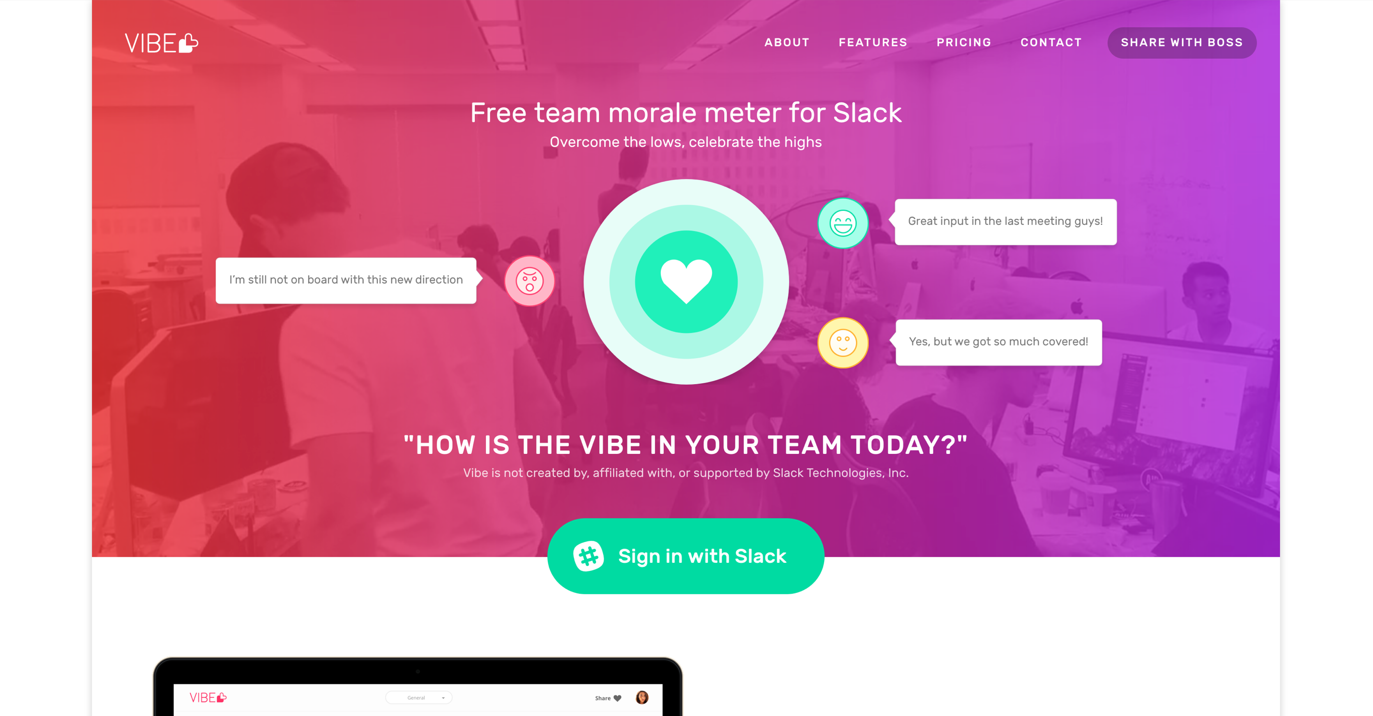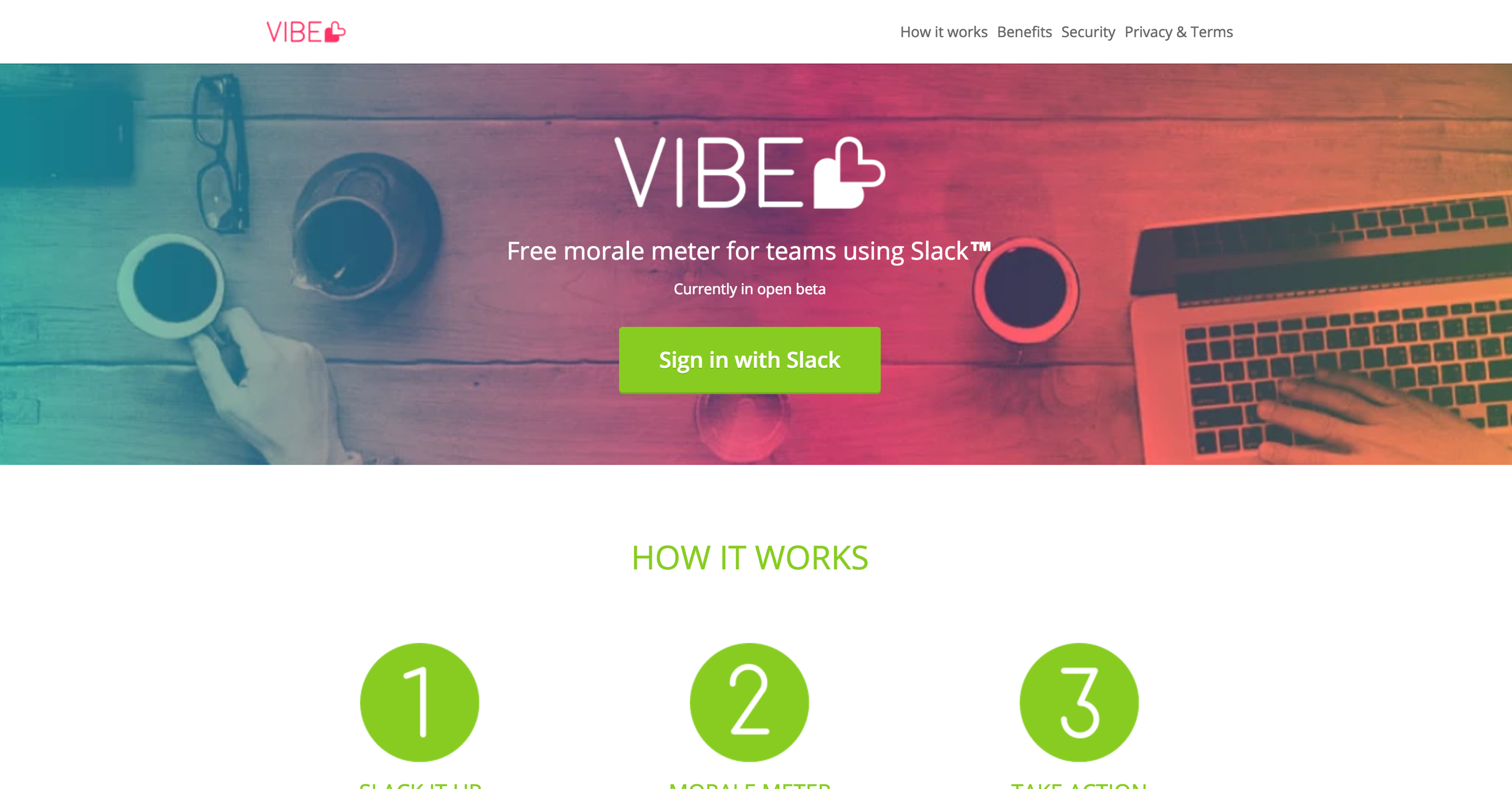 Vibe is a team morale meter for Slack, born out of an open project at AIR I was tasked to redesign the landing page with a goal to increase sign-up conversion and brand consistency. Work included information architecture, wireframing, visual design, prototyping and front-end development. Since launch in September 2016 the conversion rate has increased from 4.6% to 7%.